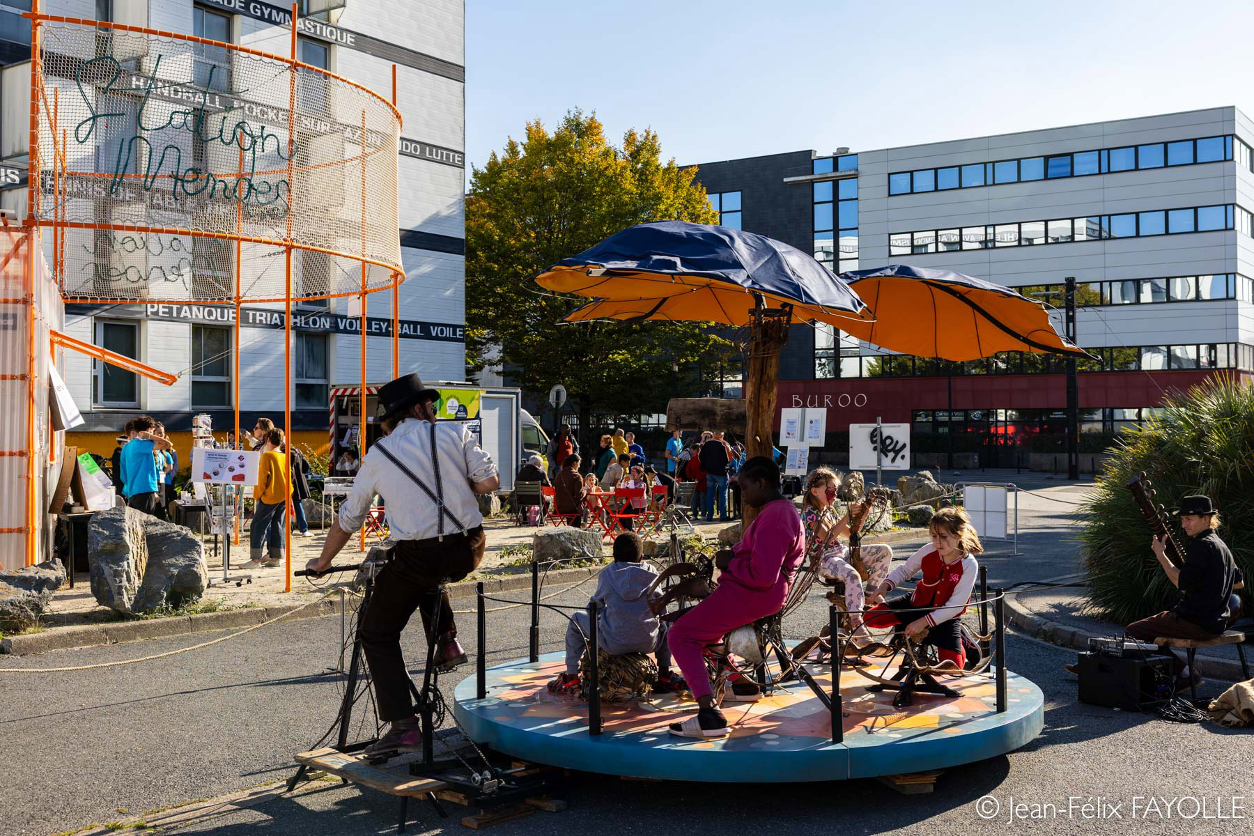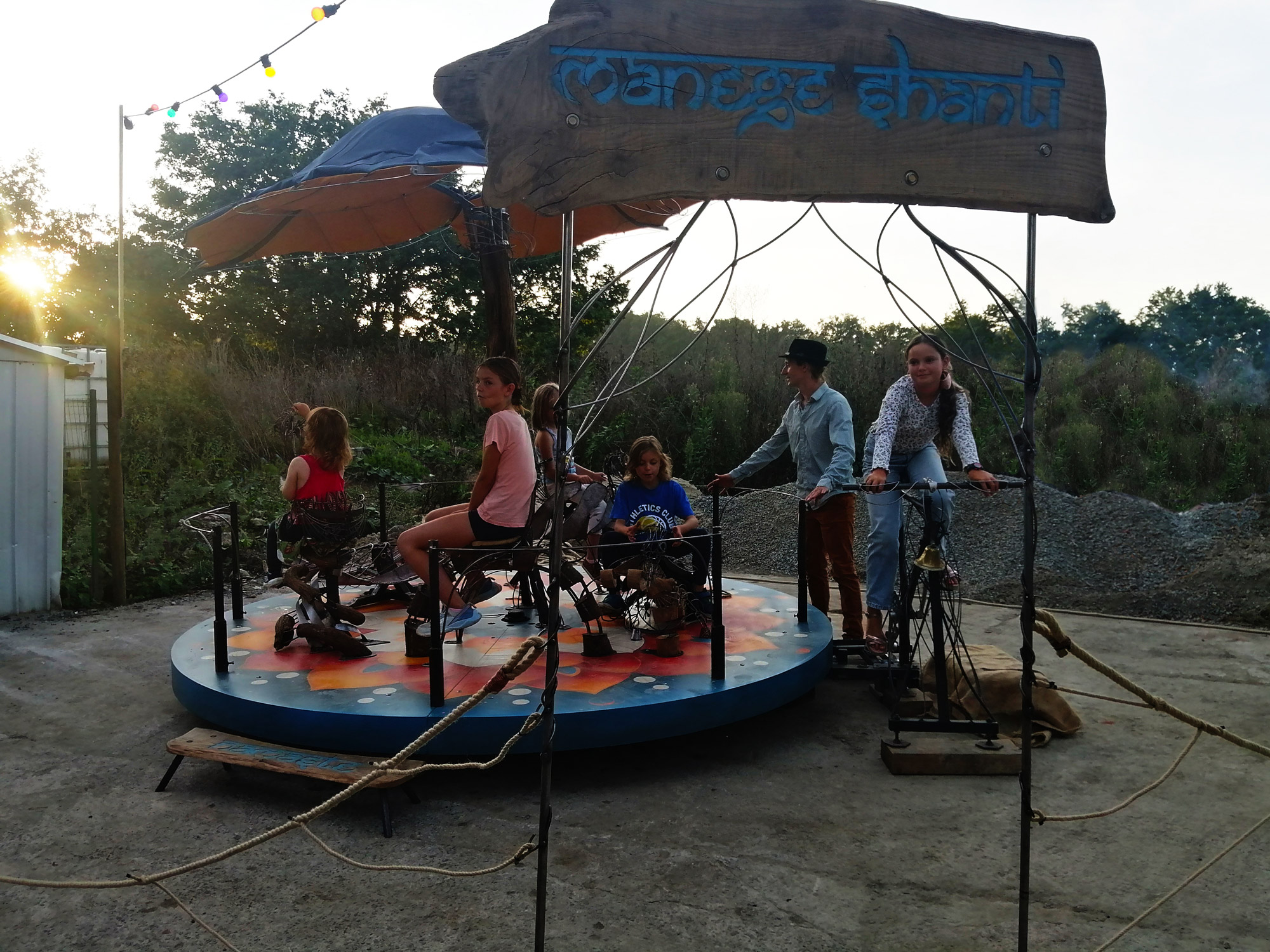 Le Manège Shanti est le premier bébé sorti de notre atelier situé à la Charpenterie, tiers lieux culturel de La Grigonnais en Loire Atlantique. Notre objectif : habiller et magnifier l’espace public et les festivals en proposant rêve et émerveillement avec un fort impact visuel empli d’émotion.